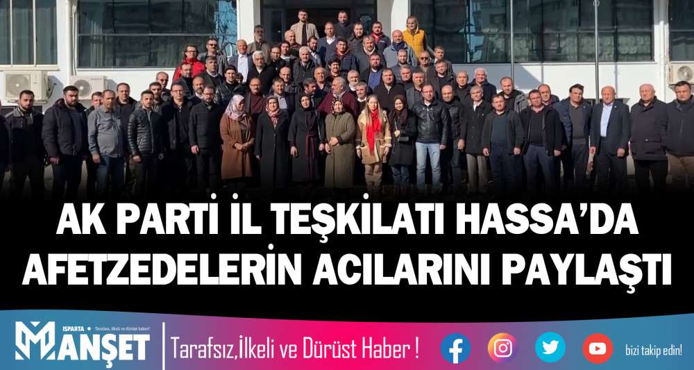 Kahramanmaraş merkezli iki büyük deprem ve Hatay’daki 6.4 şiddetindeki depremlerden etkilenen noktalardan biri de, Hassa. Hatay’ın zeytin bahçeleriyle zengin ilçesi Hassa’da birçok nokta enkaz yığınına dönüştü. AK Parti Isparta İl Başkanı Osman Zabun ve beraberindeki 128 kişilik heyet, Hassa’da afetzedelerle bir araya geldi. İl Genel Meclisi Başkanı Serkan Keskin, ilçe belediye başkanları, Merkez İlçe Başkanı Furkan Cem Er, Belediye Başkan Yardımcısı Fahretdin Gözgün, Kadın Kolları Başkanı Sevim Köse, belediye meclis üyeleri, ilçe başkanları da heyette yer aldı.