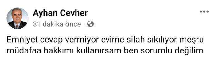 31 Mart yerel seçimleri şuana kadar ilimizde sakin geçmişken Yenişarbademliden gelen haber seçime gölge düşürdü. Bağımsız il Genel Meclis üyesi Ayhan Cevher Sosyal medya hesabından evine silahlı saldırı yapıldığını duyurdu. Manşet evi kurşunlanan bağımsız il genel meclis üyesi Ayhan Cevhere ulaşarak gelişmelerle ilgili bilgi aldı. Cevher yaptığı açıklamada şunları söyledi. 'Demokratik bir seçim oldu, elbette kazanan ve kaybeden olacaktır. AK parti burada seçimi kazanmıştır, kendilerini tebrik ediyoruz. Ne varki konvoy yapan ve evimizin önünden geçen AK partililerin evimizi hedef alan silahla ateş etmeleri sonrasında emniyeti aradım ve sosyal medyadan paylaşım yaptım. Daha büyük ve üzücü bir olay yaşanmaması için emniyetin dikkatini çektim. Şuanda havai fişek gösterileri yapılıyor ve yine evimize doğru havai fişek atılıyor' dedi. Bu arada Emniyet olası olayların önüne geçmek için güvenliği artırdı ve gerekli tetbirleri aldı.