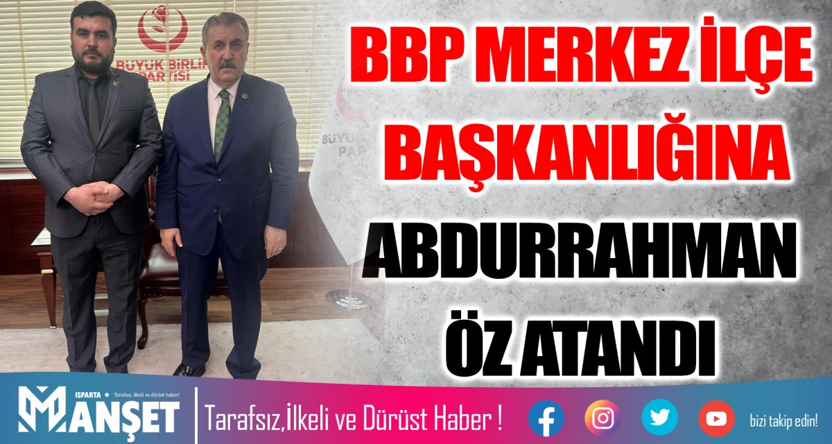 İş insanı Abdurrahman Öz, BBP Isparta Merkez İlçe Başkanlığı görevine resmen atandı. Yeni ilçe başkanının belirlenmesiyle birlikte BBP, Isparta’da daha aktif, dinamik ve halkla iç içe bir siyaset anlayışıyla sahada olacak. BBP, sadece bir siyasi parti değil, aynı zamanda birlik, beraberlik ve kardeşlik ruhunu esas alan bir dava hareketidir. Merkez İlçe Başkanı Abdurrahman Öz yaptığı açıklamada şu ifadelere yer verdi: “Genel Başkanımız Sayın Mustafa Destici’ye güvenleri için teşekkür ediyorum.