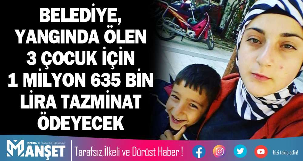 ISPARTA'nın Yalvaç ilçesinde 3 yıl önce çıkan yangında Hanım (21), Tuğçe (16) ve Faruk (5) kardeşlerin zehirlenme sonucu ölümünde ihmali olduğu gerekçesiyle Altınbaş ailesinin açtığı tazminat davasında, Yalvaç Belediye Başkanlığı 1 milyon 635 bin lira tazminata mahkum edildi.