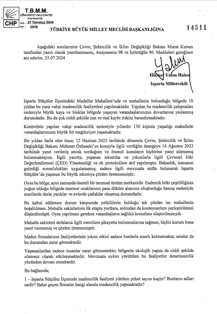 CHP Isparta Milletvekili Hikmet Yalım Halıcı, Isparta’nın Sütçüler ilçesine bağlı Çandır Köyü mevkiinde faaliyet gösteren şirketler tarafından yürütülen çalışmaların bölgede ciddi bir heyelan tehlikesi yarattığını belirterek yetkilileri göreve çağırdı.