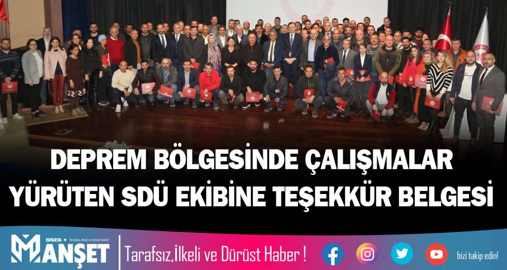 DEPREM BÖLGESİNDE ÇALIŞMALAR YÜRÜTEN SDÜ EKİBİNE TEŞEKKÜR BELGESİ