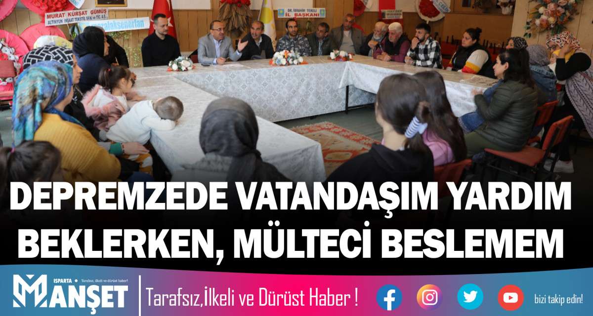 Göreve geldiklerinde depremzede vatandaşlar için her türlü desteği vereceklerini belirten Tural “Sizler ilimizde bizim misafirimizsiniz. Tabi hem devletimiz hem yere yönetimler tarafından karşılanması gereken talepleriniz var. Siz bize balık vermeyin balık tutmayı öğretin diyorsunuz. Burada depremzedelerimize meslek branşlarına göre iş bulmamız lazım. Öncelikle mesleği olup, çalışabilecek olanlara yardımcı olacağız. Tabi ki bugün ilimizde mülteciye gösterilen ilgi alaka verilen desteği bizim kendi vatandaşımıza daha çok göstermemiz lazım. Mülteciler için diyoruz ki, Isparta’da misafirlik artık bitti. Artık ülkelerine dönsünler. Bizler depremzede vatandaşlarımıza bakmak zorundayız. Göreve geldiğimizde sizlerin her türlü ihtiyacını karşılamak bizlerin görevi. Sizler bizim vatandaşımızsınız. Mültecilerle sizleri bir tutmamız mümkün değil. Yerel yönetim olarak sizlere yapılması gereken neyse biz onu yaparız. Sizler bizim baş tacımızsınız” dedi. İYİ PARTİ BASIN / BÜLTEN