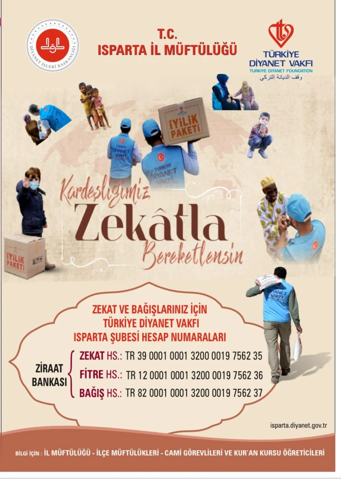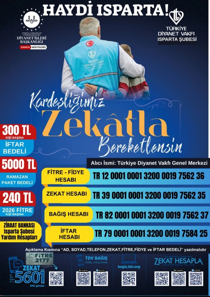Türkiye Diyanet Vakfı’ndan Isparta’ya Zekât ve İftar Çağrısı Türkiye Diyanet Vakfı Isparta Şubesi, Ramazan ayı dolayısıyla hayırsever vatandaşlara yönelik anlamlı bir yardım kampanyası başlattı. “Haydi Isparta! Kardeşliğimiz Zekâtla Bereketlensin” sloganıyla duyurulan kampanyada, zekât, fitre, fidye ve iftar bağışlarıyla ihtiyaç sahiplerine destek olunması çağrısında bulunuldu. Ramazan ayının paylaşma, dayanışma ve kardeşlik ayı olan yapılacak bağışların hem yurt içinde hem de yurt dışında ihtiyaç sahiplerine ulaştırılacağını belirtti. Belirlenen Bağış Tutarları: Kişi başı iftar bedeli: 300 TL Ramazan paket bedeli: 5.000 TL 2026 yılı fitre bedeli (kişi başı): 240 TL Bağış yapmak isteyen vatandaşlar için Ziraat Bankası Isparta Şubesi üzerinden farklı hesap numaraları paylaşıldı. Fitre–fidye, zekât, bağış ve iftar için ayrı ayrı hesaplar oluşturulurken, açıklama kısmına “Ad, Soyad, Telefon, Zekât, Fitre, Fidye ve İftar Bedeli” bilgilerinin yazılması gerektiği hatırlatıldı. Ayrıca SMS ve online bağış seçeneklerinin de bulunduğu kampanyada, vatandaşlar mobil uygulama ve internet sitesi üzerinden de destek olabilecek. Isparta halkının her zaman hayır faaliyetlerinde öncü olduğunu vurgulayarak, “Bir sofraya umut, bir kalbe sevinç olmak için tüm hemşehrilerimizi destek olmaya davet ediyoruz” mesajını paylaştı
