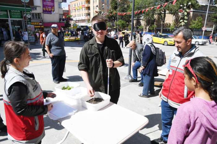 Meydana kurulan empati standında sağlıklı bireyler, yürüme engelli vatandaşların kullandıkları tekerlekli sandalyelerle parkuru geçerken, gözlerine bant takan vatandaşlarda baston ile yön bularak, kendileri için hazırlanan bitiş noktasına ulaşmak için çaba sarf etti. Vatandaşlar gözleri kapalı olarak yaprak, kağıt ve kum olan kutulara ellerini sokarak bu maddelerin ne olduğunun cevabını vermeye çalıştılar.
