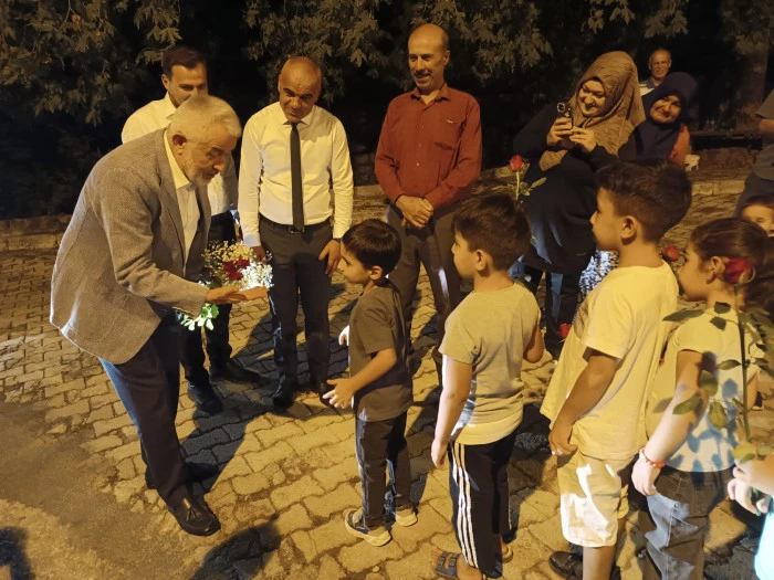 Çocuklar ellerinde gül ve çiçeklerle Şükrü başkanı selamladılar.