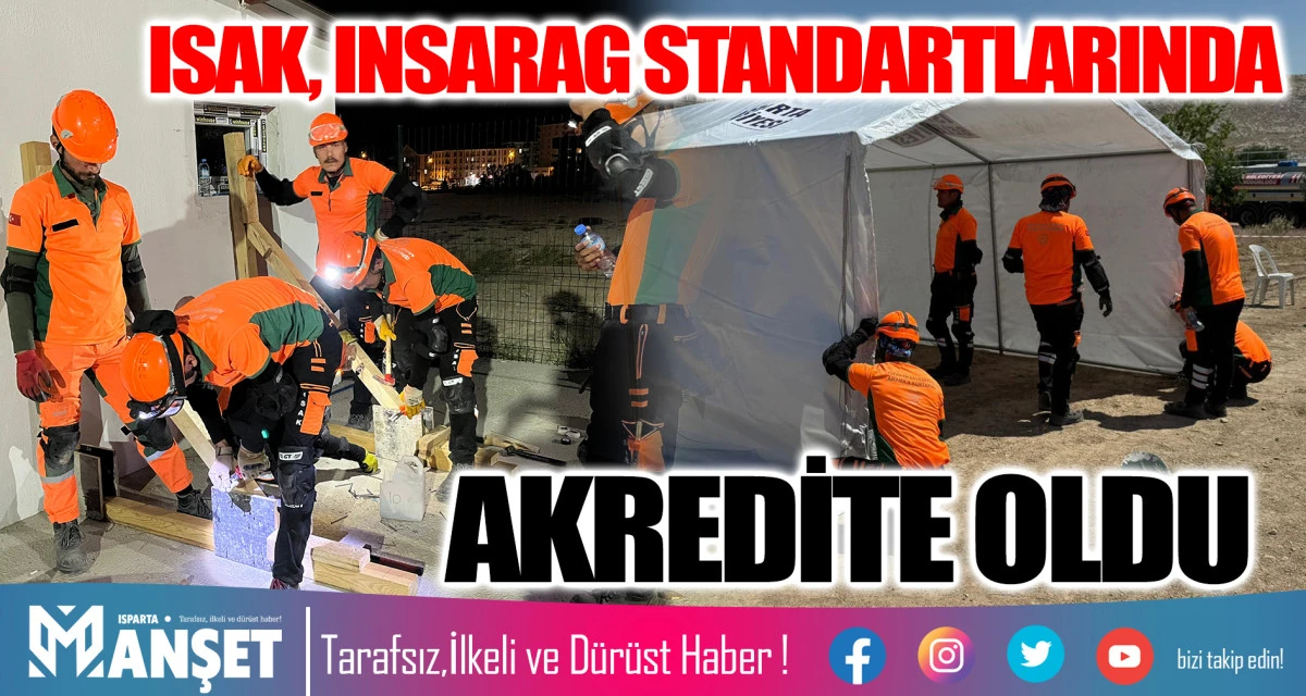 Isparta Belediyesi Arama Kurtarma Ekibi (ISAK) Orta Seviye Kentsel Arama Kurtarma Akreditasyon Sınavı’nı geçerek, Uluslararası Arama ve Kurtarma Danışma Grubu (INSARAG) standartlarında akredite olma başarısı gösterdi.