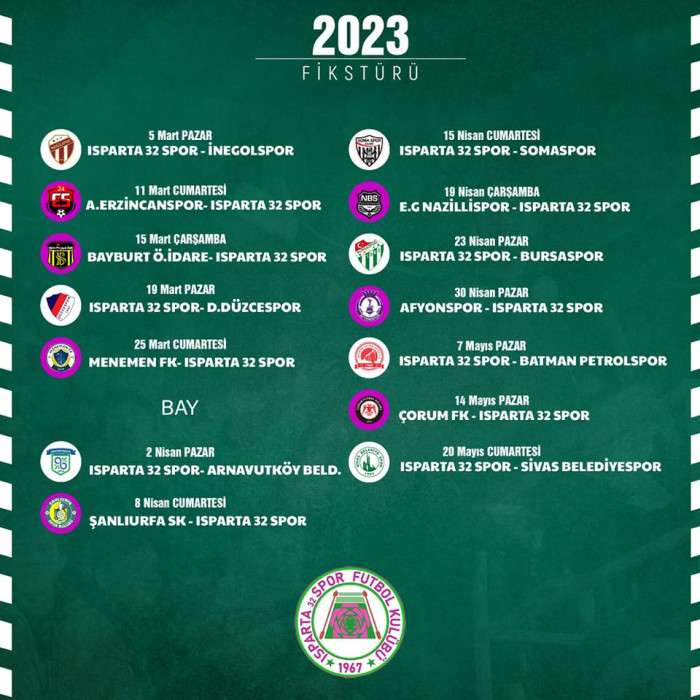 Asrın felaketi sonrası ara verilen futbol müsabakaları yeniden başlıyor. 2. Lig'te mücadele eden Isparta 32 Spor'un da fikstürü belli oldu. Yeşil-pembeliler ilk maçını 5 Mart Pazar Günü İnegölspor ile yapacak. Karşılaşma Isparta'da oynanacak.