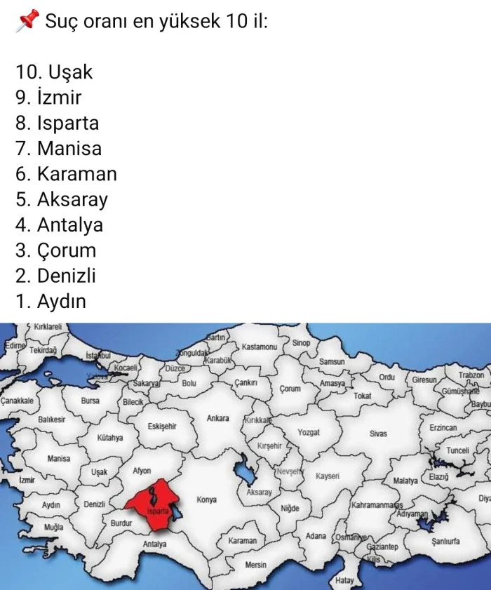 Başta madde bağımlılığı olmak üzere çeşitli suclarda Türkiye ortalamasının üzerinde olan Isparta, son yıllarda Emniyet ve jandarmanın yoğun ve titiz çalışması ile suçlularla mücadelede gözle görülür bir azalma olsada TÜİK verilerine göre hala ilk 10 il arasindayiz.