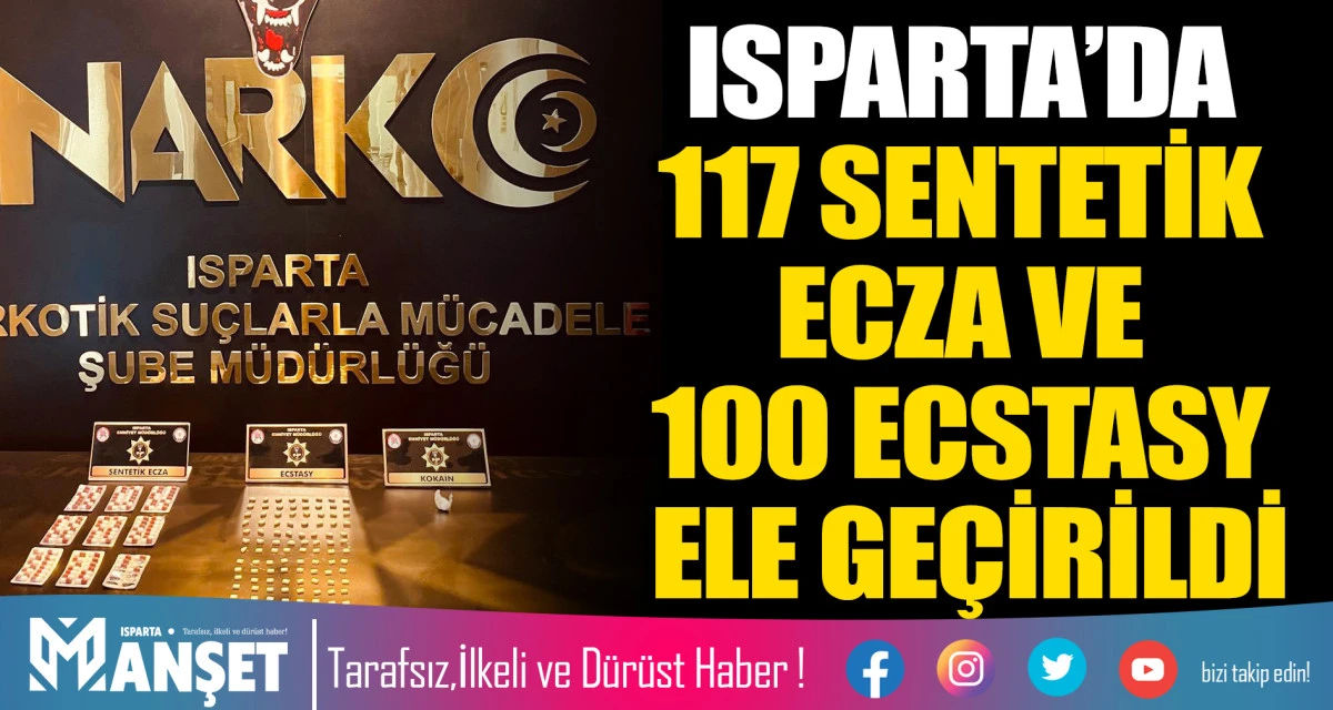 Isparta'da dün uyuşturucu madde ticareti ve naklinin önlenmesine yönelik gerçekleştirilen operasyon kapsamında 117 adet sentetik ecza, 100 adet ecstasy ve 3,45 gram kokain ele geçirildi.