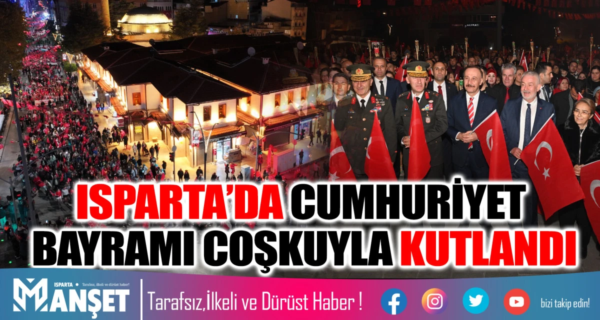 Cumhuriyetin ilanının 102. Yıl dönümünde Isparta Belediyesi önünden başlayan fener alayına Isparta Valisi Abdullah Erin, Garnizon Komutanı Tuğgeneral Merdin Kışkan, Isparta Belediye Başkanı Şükrü Başdeğirmen ve eşi Şadiye Başdeğirmen, sivil toplum kuruluşu temsilcileri, askeri erkan ve vatandaşlar katıldı. Binlerce Ispartalı, ellerinde Türk Bayraklarıyla yürüyerek, Cumhuriyet Bayramı coşkusunu yaşadı.