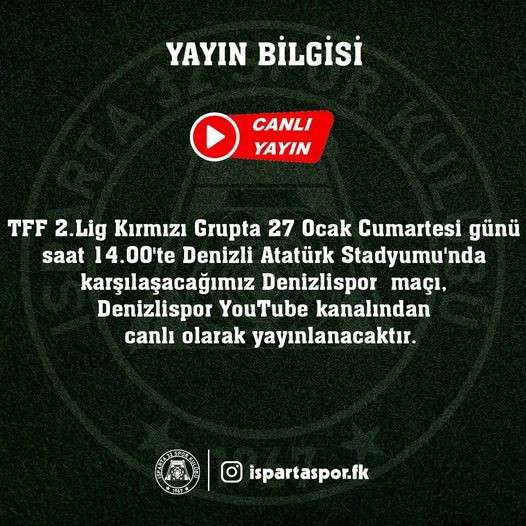 Türkiye 2. Futbol Ligi Kırmızı Grupta mücadele eden Isparta 32 Spor, 27 Ocak Cumartesi günü Denizlispor’la deplasmanda karşılaşacak. TFF 2. Lig'in 20. Haftasında Denizlispor-Amed Sportif Faaliyetler maçında yaşanan olayların faturası belli olmuştu. Profesyonel Futbol Disiplin Kurulu, yeşil siyahlılara taraftarların neden oldu kötü ve çirkin tezahüratın ev sahibi olduğu maçlarda 5.kez gerçekleşmesinden dolayı kendi sahasında 1 maç seyircisiz oynama ve 12 bin TL pazar cezası verdi. Kurul ayrıca, taraftarının neden olduğu kötü ve çirkin tezahürat nedeniiyle 80 bin TL, taraftarının neden olduğu saha olayları nedeniyle 56 bin lira para cezası verdi. Denizlispor, 27 Ocak'ta sahasında oynayacağı Isparta 32 Spor maçını seyircisiz oynayacak. Karşılaşmaya Ispartaspor taraftarı izleyebilecek.