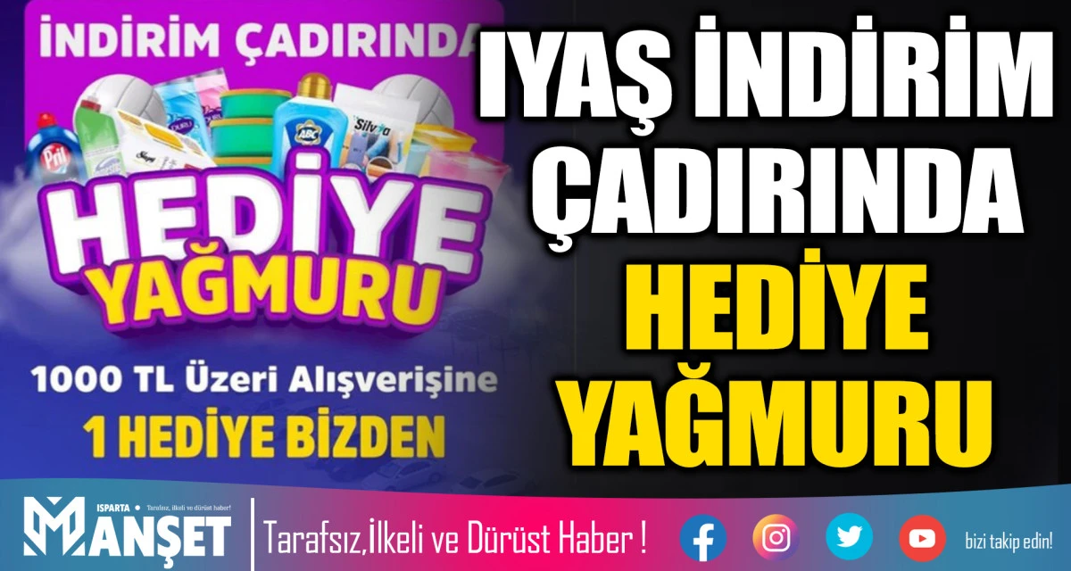 Isparta’da her yıl geleneksel olarak düzenlenen IYAŞ İndirim Festivali’ne ek olarak "Hediye Yağmuru" kampanyasını başlattı. 26 Nisan tarihine kadar, eski otogar alanında kurulan temizlik ve züccaciye çadırında, 1.000 TL ve üzeri alışveriş yapan tüm vatandaşlar, günlük hayatta işlerine yarayacak seçili ürünlerden birine bedelsiz sahip oluyor.