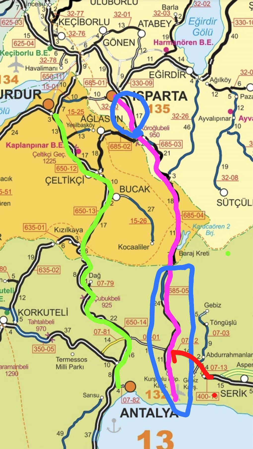 Şimdi siz karar verin hangi yolu tercih edersiniz, mavi ile çerçevelenmiş kısım zaten duble yol, geriye kalan kısım işte bu kadar. Kırmızı ile işaretlenen Mersin yolu bağlantısı tamamlandığı zaman Dereboğazı yolu daha da önemli olacaktır.
