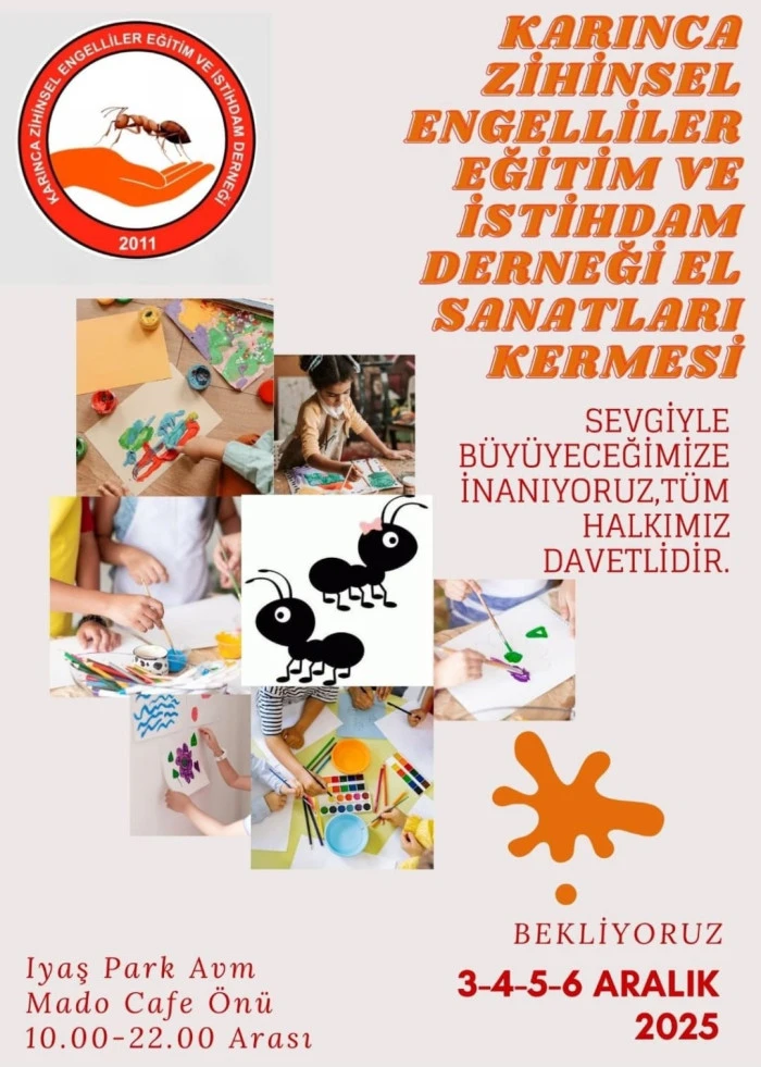 3-6 Aralık 2025 tarihleri arasında Iyaşpark AVM Mado Cafe önünde gerçekleştirilecek olan kermeste, örgü ve el işleri, ahşap boyama ürünler, takılar ve organik oyuncakların satışa sunulacağı bildirildi. 4 gün boyunca açık kalacak etkinlikten elde edilen gelir, özel çocukların ihtiyaçlarını karşılamak için kullanılacak.
