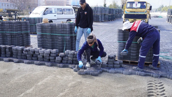 Kafenin yanında düzenlenen otopark için kilit parke taşları döşeniyor