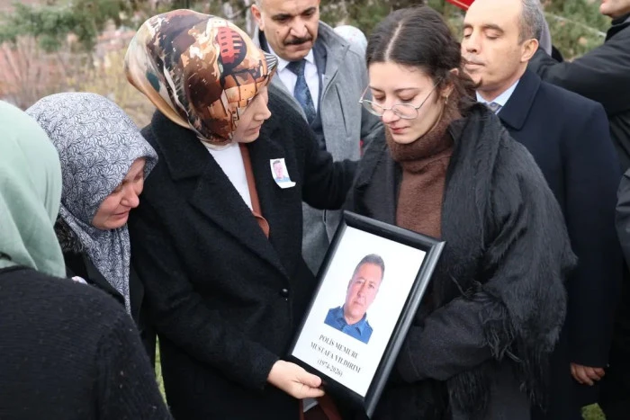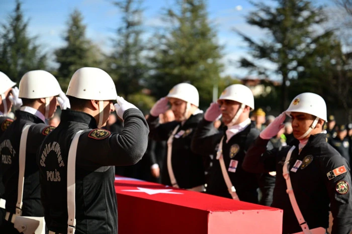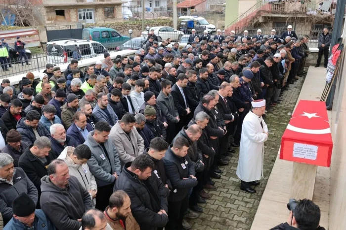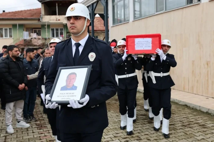 Türk bayrağına sarılı naaş, tören mangası eşliğinde ambulansa taşındı. Duygusal anların yaşandığı törende meslektaşları Mustafa Yıldırım’ı son kez selamladı.