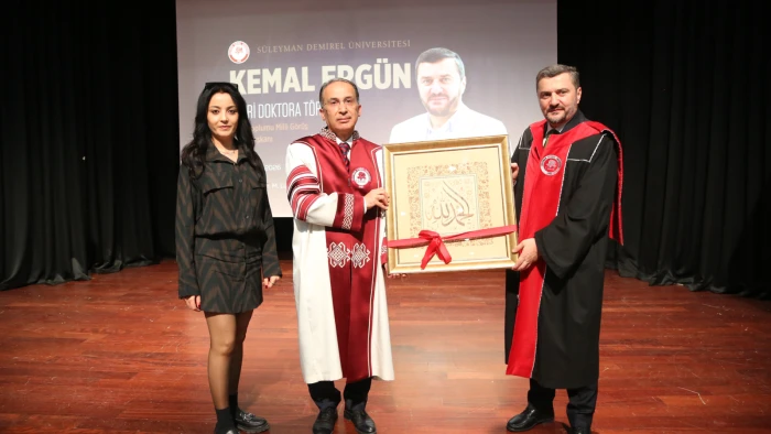 Açılış konuşmalarının ardından İslam Toplumu Milli Görüş Genel Başkanı Kemal Ergün’e Fahri Doktora Payesi SDÜ Rektörü Prof. Dr. Mehmet Saltan tarafından takdim edildi.