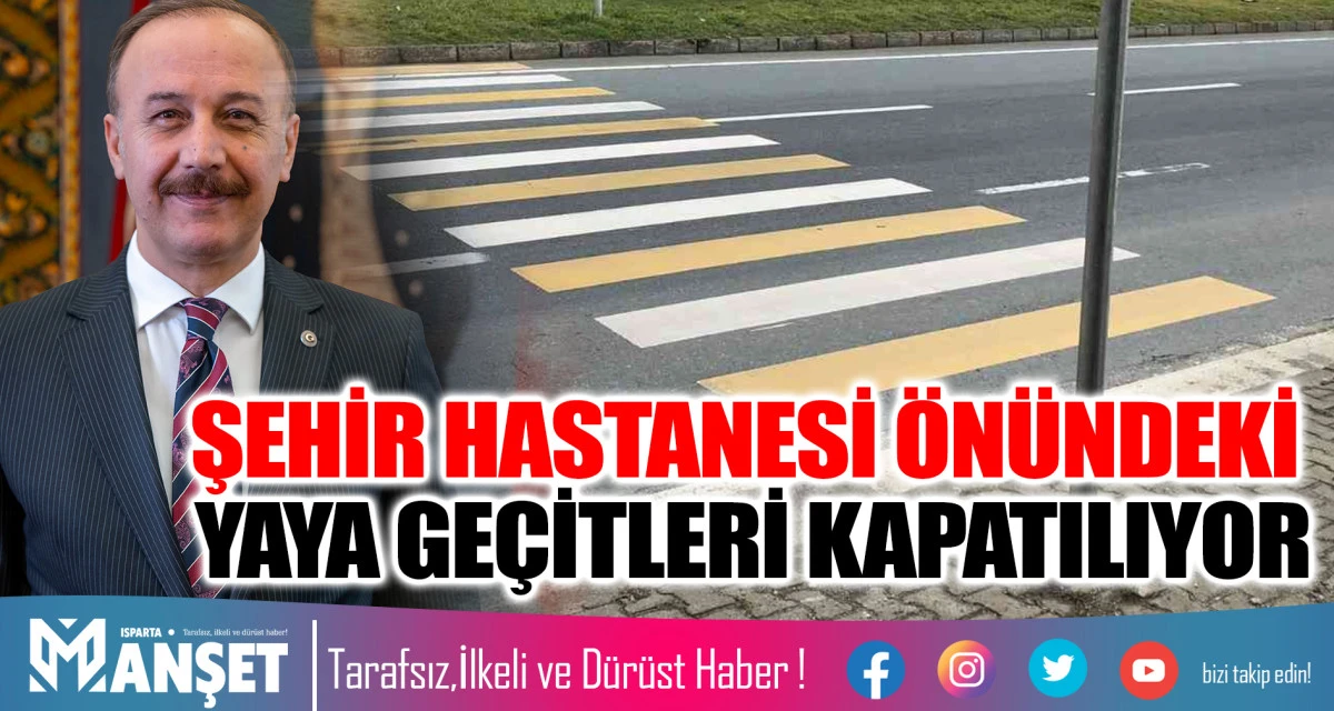 İl Trafik Komisyonu Başkanlığı tarafından alınan karara göre, Isparta Şehir Hastanesi önünde bulunan 104. Cadde üzerindeki 1 ışıklı ve 3 ışıksız yaya geçidi kapatılacak. Yayalar artık yürüyen merdivenli üst geçidi kullanacak.