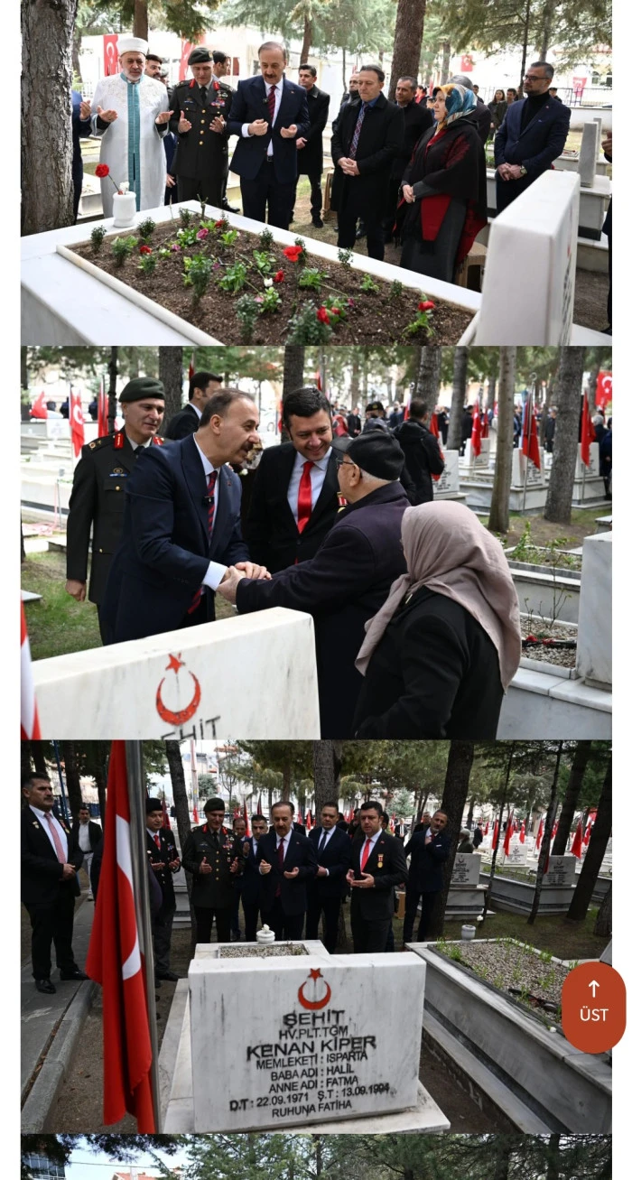 Şehitlerimi z kabirler i başınd a anıld Val i Abdulla h Erin , 1 8 Mar t Şehitler i Anm a Gün v e Çanakkal e Zaferi’ni n 111’inc i yı l dönüm dolayısıyl a şehitler i kabirler i başınd a ziyare t edere k dualarl a andıkların açıkladı . Ispart a valis i Abulla h Erin , sosya l medy a hesabında n yaptığ paylaşımda , vata n uğrun a canların fed a ede n azi z şehitleri n kabirler i başınd a anıldığın belirtti . Erin , şehi t ailelerin e d e başsağlığ dileklerin i ilettiklerin i ifad e etti . Val i Eri n paylaşımında , Çanakkale’d e verile n destans mücadeleni n Tür k milletini n bağımsızlı k iradesini n e n güçl göstergelerinde n bir i olduğun u vurgulayarak , “Çanakkale’ni n geçilmeyeceğin i v e b u millet e boyunduru k vurulamayacağın emperyalistler e karş verile n destans mücadeleyl e tü m dünyay a göstere n ecdadımızı n torunlar olara k onları n izinde n gidiyoruz . B u vatanı n bi r karı toprağınd a göz olan a ayn kararlılıkl a ceva p veriyoru z v e vermey e d e deva m edeceğiz ifadelerin i kullandi . Azi z şehitleri n emanetlerin e sahi p çıkılmas gerektiğin i d e belirte n Erin , onları n canlar pahasın a bıraktığ vata n içi n aziml e çalışmay sürdüreceklerin i kaydetti . Val i Erin , paylaşımınd a bi r ke z dah a şehitler i rahmet , minne t v e şükranl a andığın belirtere k şehi t ailelerin e sabı r dileklerin i iletti.