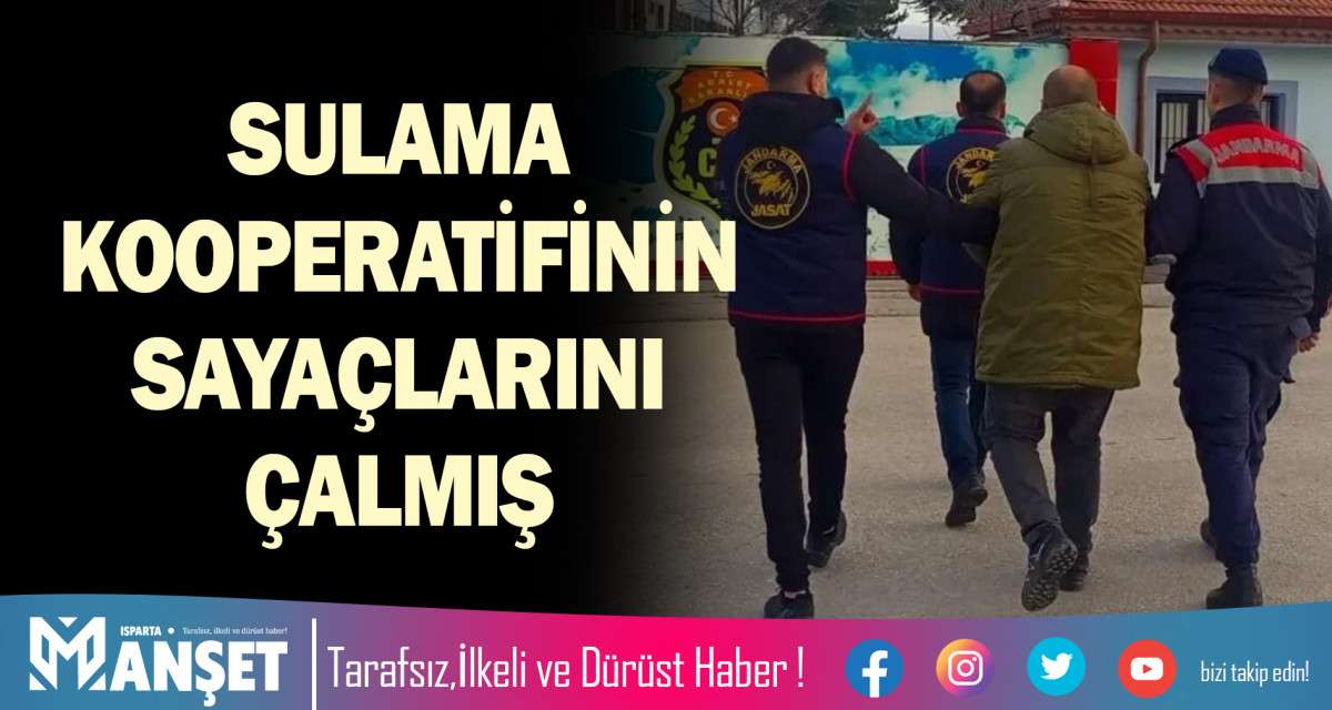 Isparta Gönen ilçesinde geçen 06 Ocak günü Sulama Kooperatifine ait 31 adet sayaç/vana koruma kapağı çalındı. Jandarma ekipleri tarafından şüphelilerin yakalanması için çalışma başlatıldı. Çalınan malzemelerden 10 adedini Ö.T.’nin hurdacılara satıldığı tespit edildi. Yapılan operasyonla gözaltına alınan Ö.T’nin evinde yapılan aramada da 21 adet koruma kapağı ele geçirildi. Şüpheli Ö.T. ifadesinin ardından sevk edildiği mahkemece tutuklanarak Isparta E Tipi Kapalı Ceza İnfaz Kurumu’na teslim edildi