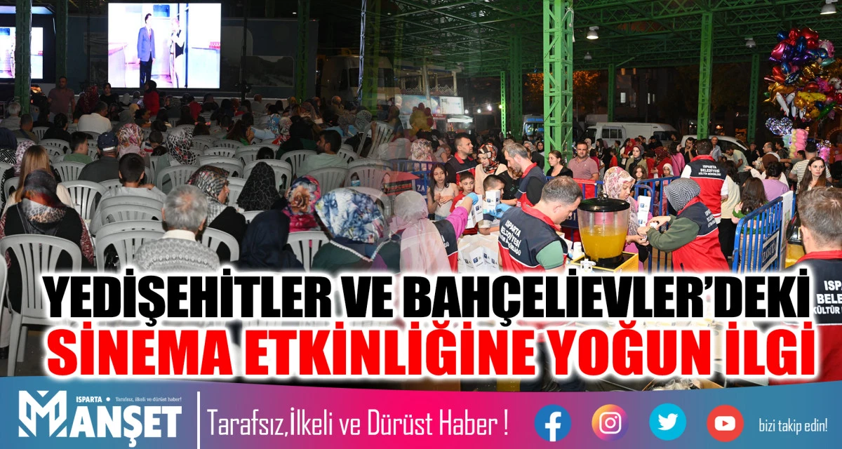 Isparta Belediyesi tarafından yaz aylarında vatandaşların güzel ve eğlenceli vakit geçirebilmeleri için ‘Yaz Seninle Güzel’ sloganı ile düzenlenen Yaz Akşamı Sineması etkinliği, Yedişehitler ve Bahçelievler Mahalleleriyle devam etti. Yedişehitler Mahallesi Cuma Kapalı Pazaryerinde düzenlenen etkinlikte çocuklar gönüllerince eğlendi, vatandaşlarda Yeşilçam’ın unutulmazları arasında yer alan bir filmi izledi.